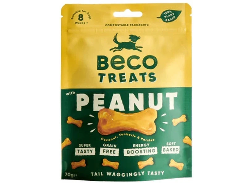 Beco Dog Treats in Peanut with Coconut & Turmeric are a tasty, healthy option for your dog. These treats are made with plant-based protein and ingredients that support your pet’s health, including peanuts for energy and focus, turmeric for its anti-inflammatory properties, and coconut for a naturally sweet flavor.