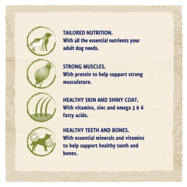 - phosphorus and vitamin D to help maintain your dog’s strong bones, healthy joints and teeth;
