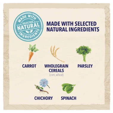 Cereals, meat and animal derivatives (8%), vegetable protein extracts, oils and fats, derivatives of vegetable origin, vegetables (dried chicory root 1.1%), minerals.