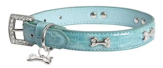 This gorgeous aqua blue snakeskin print collar is embellished with little diamante bones for an extra stylish design.