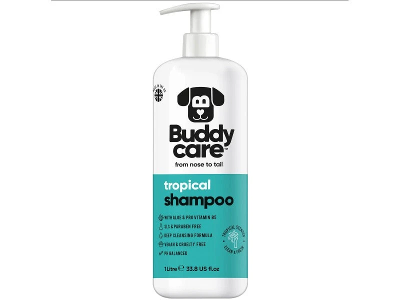 BuddyCare Shampoo for dogs is a specially formulated cleansing product designed to promote healthy skin and a shiny coat while effictively removing dirt, debris and odours. The tropical scent creates a pleasant scent that keeps your dog smelling good long after bath time.