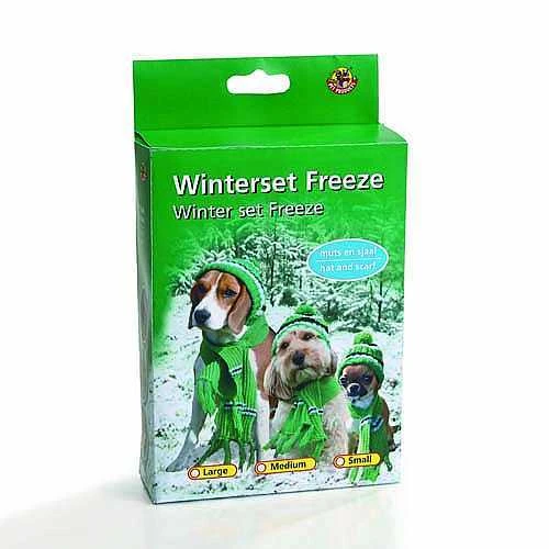 Keep your dog warm this winter with the Pet Products Winterset Freeze hat and scarf set for dogs. This winter set contains a hat and scarf to keep your dog warm during their daily winter walks. An elastic band attached to the hat makes sure it stays in place. By threading the scarf through its two openings it remains in place.