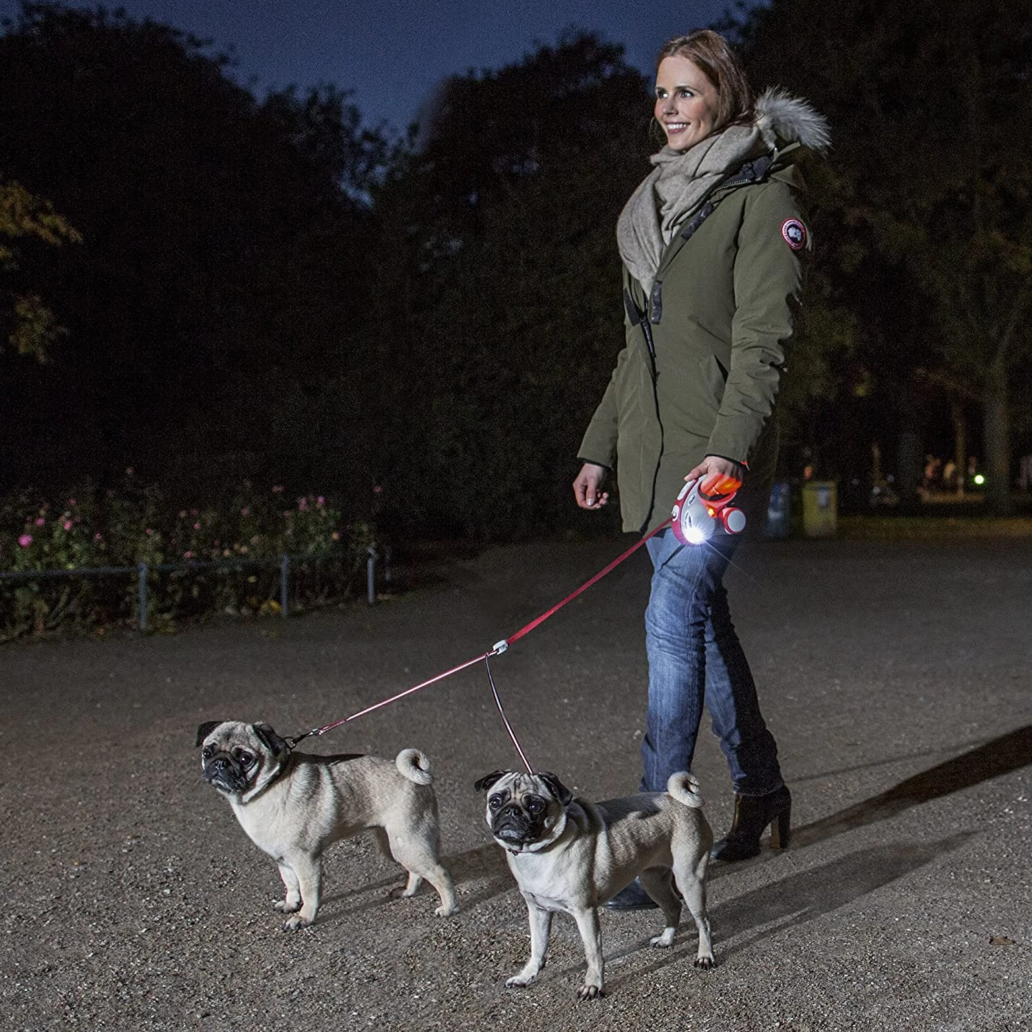 The VARIO Duo Belt S, color-coordinated with the VARIO retractable lead, lets you walk two small dogs weighing up to 11 lbs each (up to 22 lbs of total weight) on one lead.