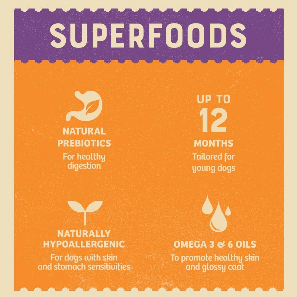 - Natural Antioxidants – Junior dog food with kale, pomegranate, green tea and rosemary to support your dog’s natural defences.