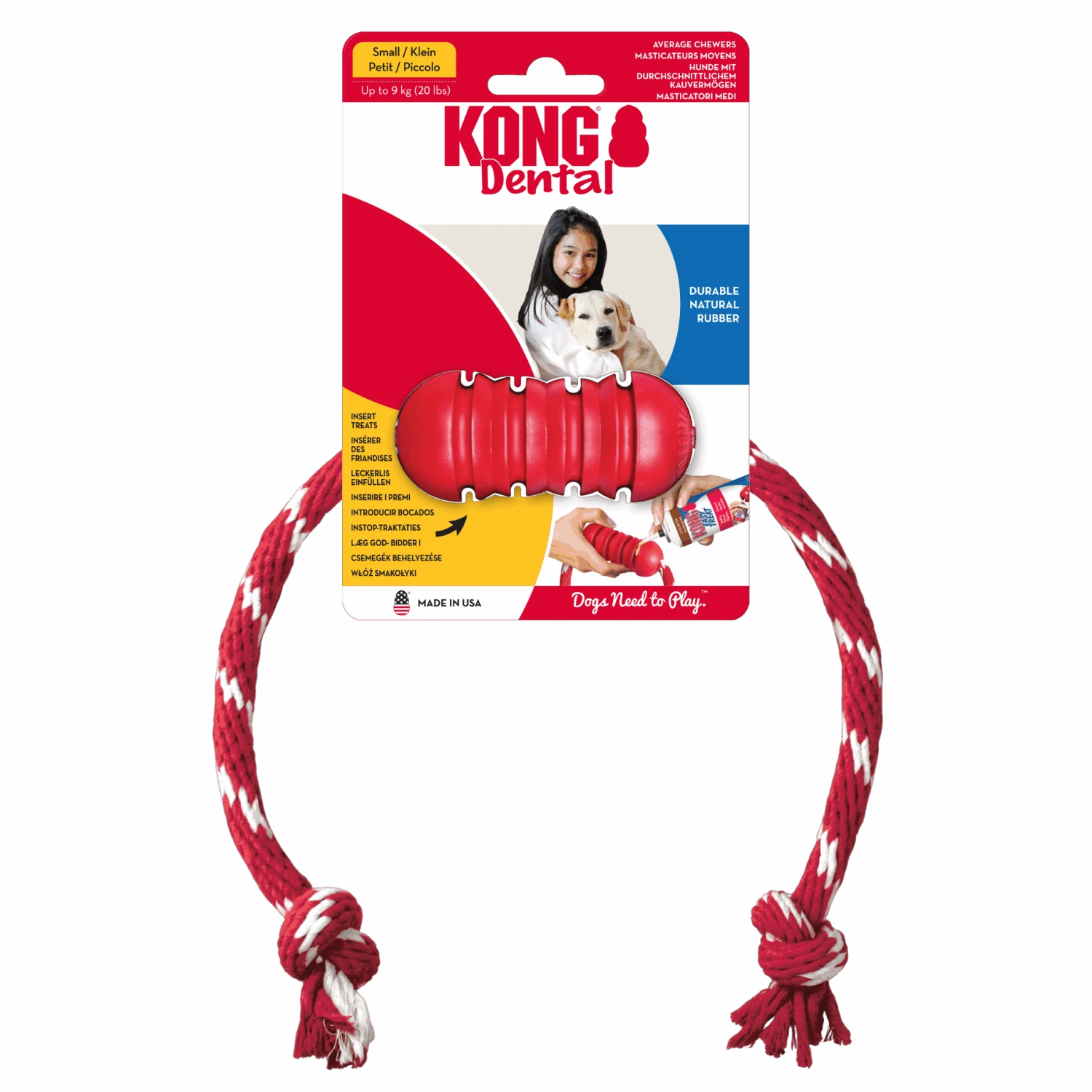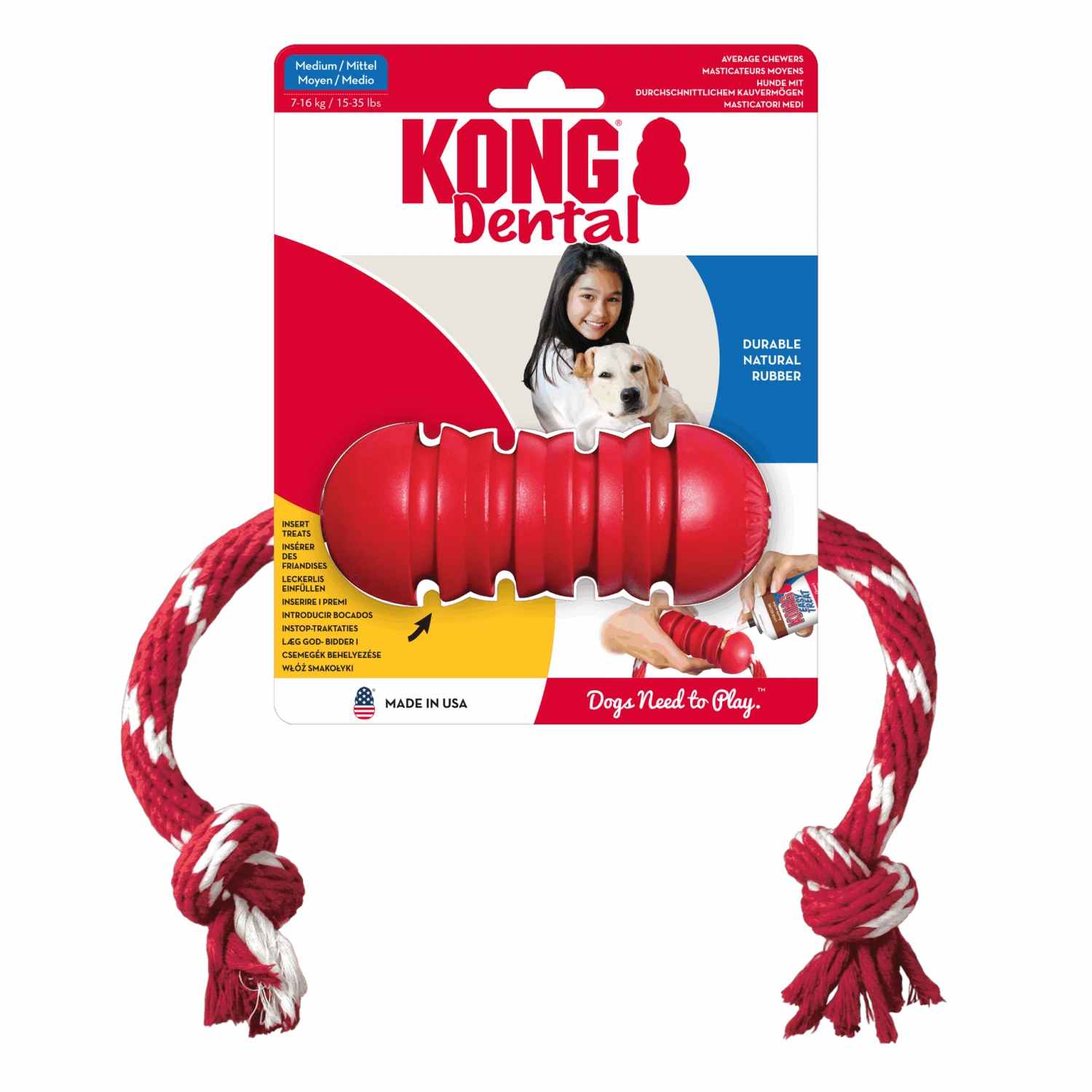 The KONG Dental with Rope toy is designed to support a dog’s daily dental health and enrichment routine. Made from KONG Classic’s red rubber formula, unique ridges and grooves help to clean your dog’s teeth and massage their gums. The all-natural rope allows for beneficial chewing and tugging sessions, flossing between teeth as dogs chew, and the rope frays. Fill the ridges with KONG Easy Treat™, to extend your dog’s chewing time. Always observe your dog during playtime for safety.