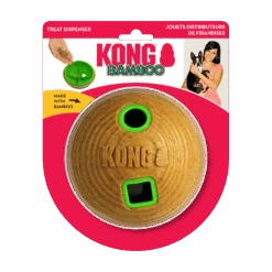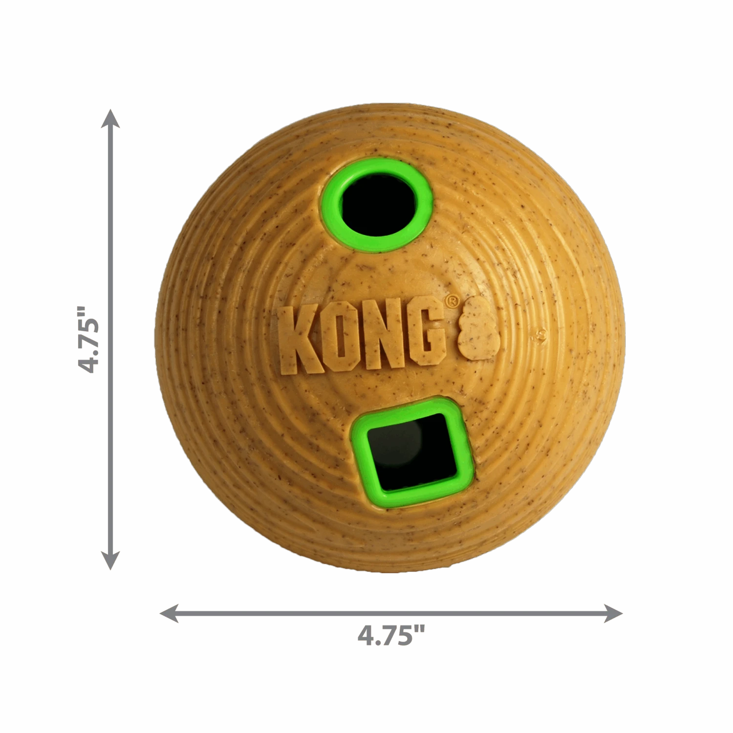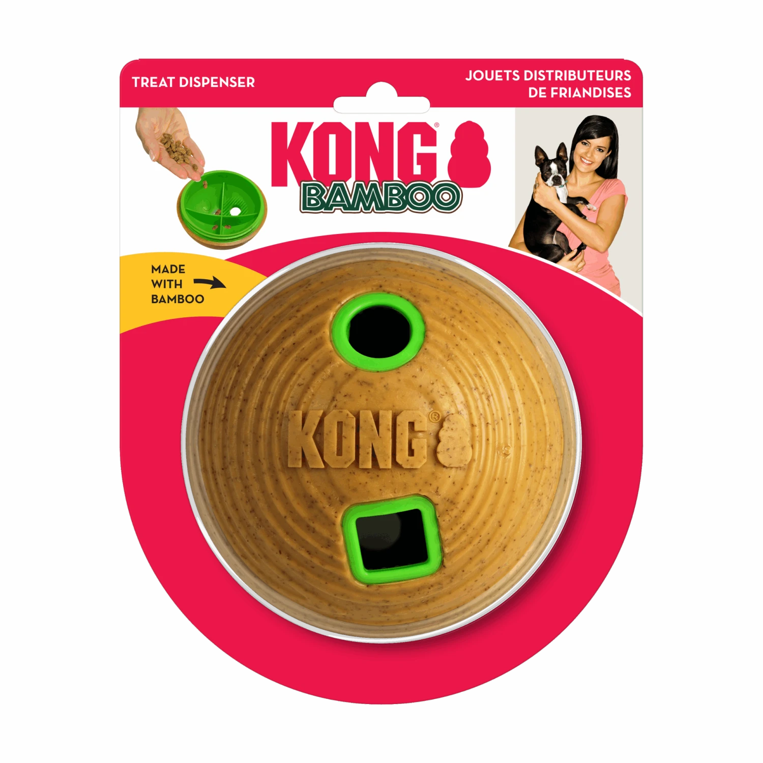 Twist open and fill with kibbles or treats and the irresistibly unpredictable way KONG Bamboo dispenses snacks, hooks dogs into extended bouts of play that busies body and mind. Use for kibbles at mealtime to slow eating and help with weight management. A natural twist (and roll) on interactive dog toys, the durable, bamboo-infused material mutes noise for quieter play sessions.