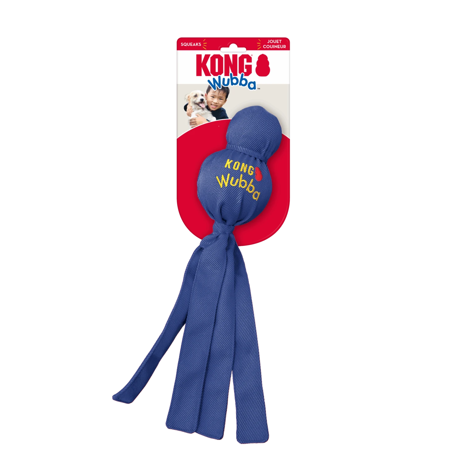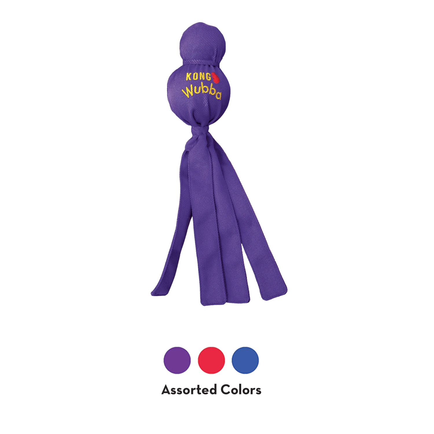 The KONG Wubba™ is a fun, interactive tug and toss toy that is great for interactive or solo play. Its long floppy tails are ideal for shaking and tugging instincts as well as games of fetch. A durable reinforced nylon exterior combines with unique ball shapes for play sessions that last longer. Dogs love to squeak the Wubba™ and add to the fun by shaking the flapping tails back and forth making every game different from the next.