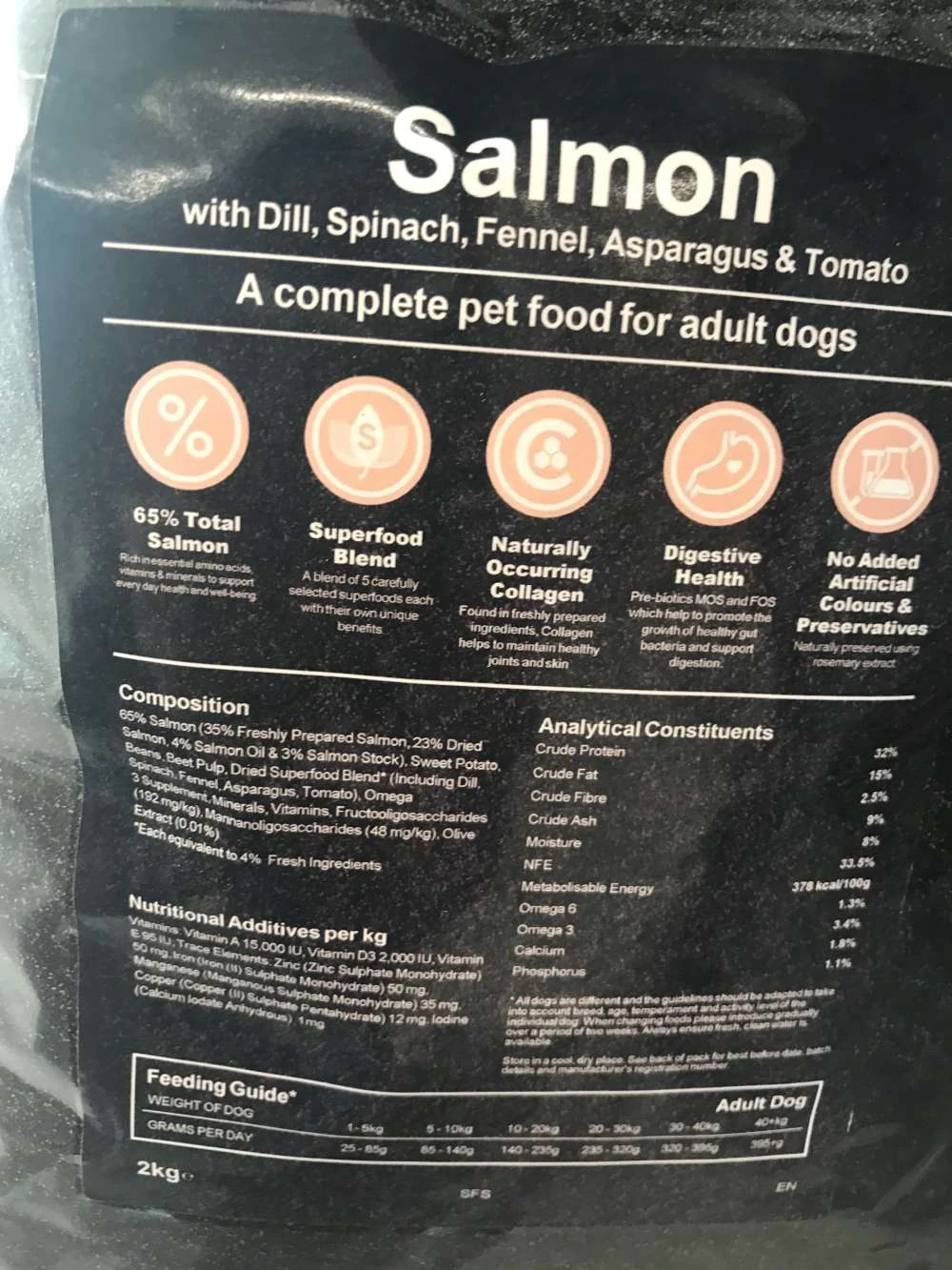 - 35% freshly prepared salmon (human-grade quality raw, fresh salmon)