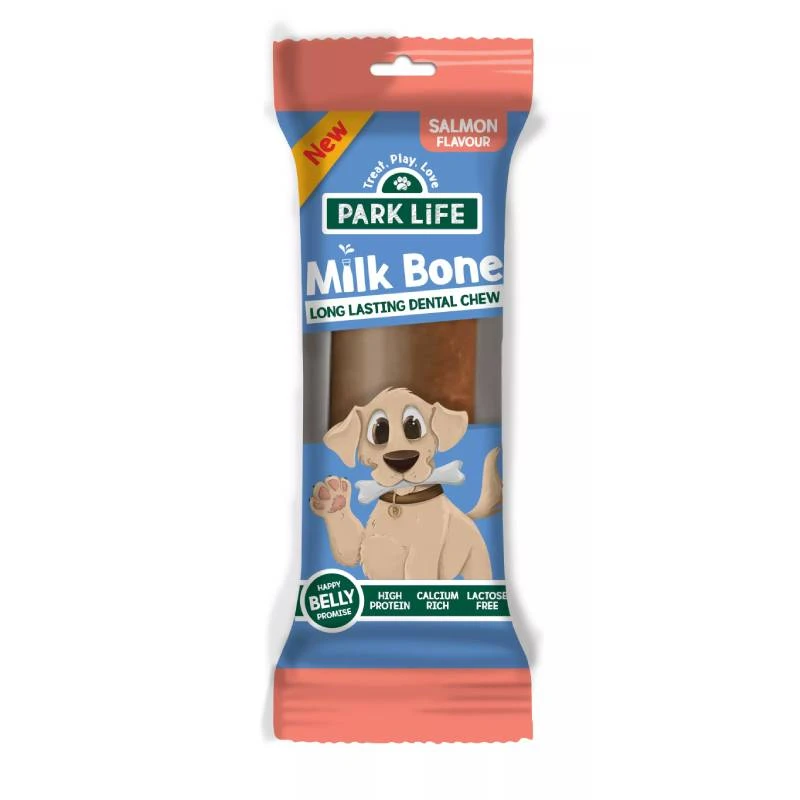 PARK LiFE Salmon Flavour Milk Bones are long-lasting “super chews”, made with human quality milk protein. Each bone-shaped chew helps to relieve boredom for up to 1 hour (or longer depending on the dog), while cleaning teeth and supporting strong muscles and bones. These Milk Bones are the safest long-lasting dog chew available and most importantly…Milk Bones do not splinter link regular bones!