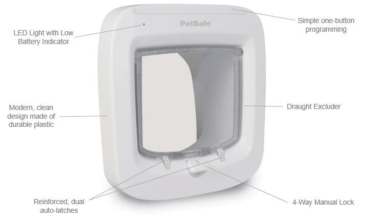 When your cat approaches the flap, the cat flap will respond by allowing only your feline friend to enter. The cat flap will remain locked and deny access to cats that are not programmed, wild animals, pests and strays. The cat flap is also designed with a convenient Manual 4-Way lock that allows you to control the access of your programmed cats.