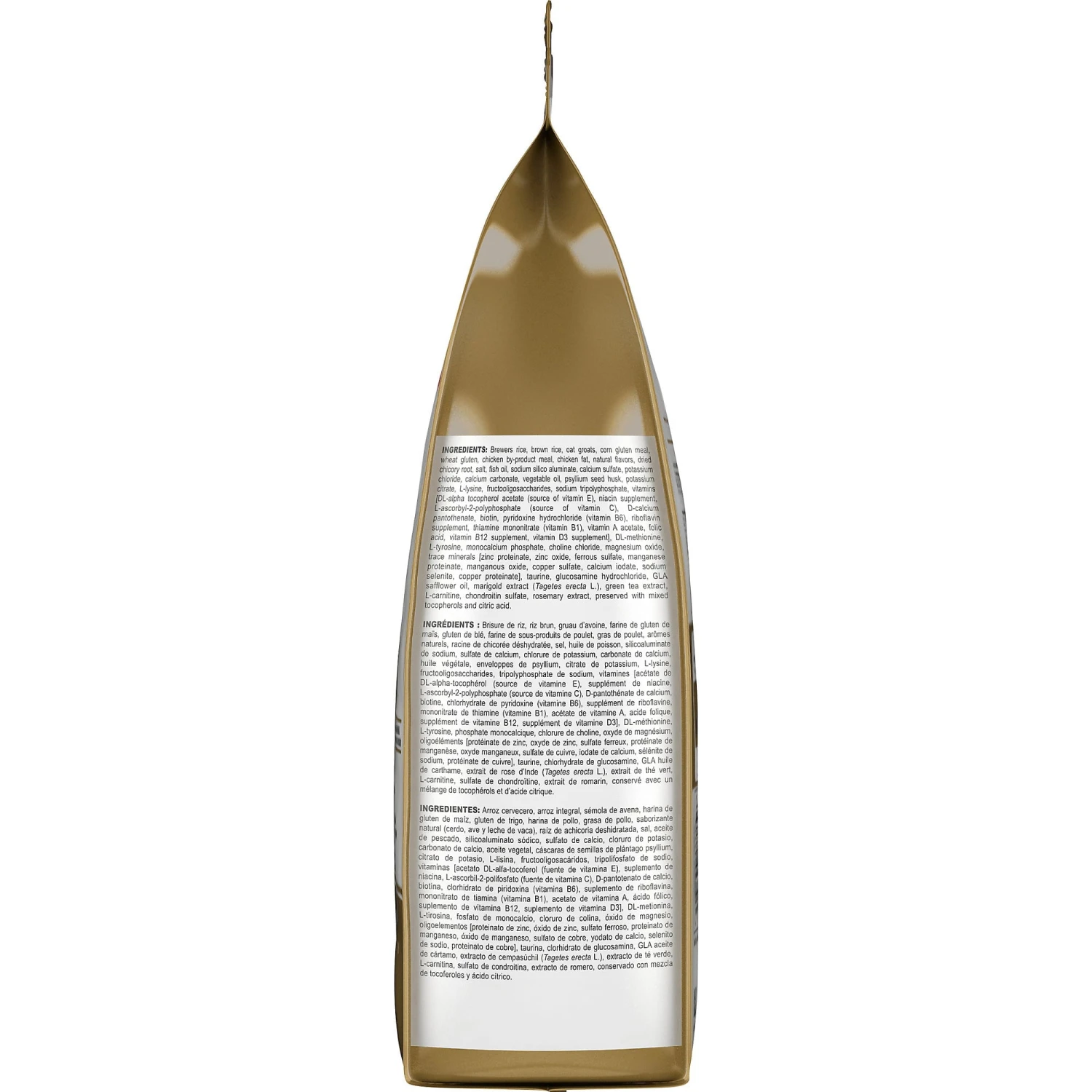 Rice, dehydrated poultry protein, maize, vegetable protein isolate*,maize gluten, animal fats, minerals, hydrolysed animal proteins, chicory pulp, fish oil, vegetable fibres, psyllium husks and seeds, fructo-oligo-saccharides, soya oil, borage oil, green tea and grape extracts (source of polyphenols), hydrolysed crustaceans (source of glucosamine), marigold extract (source of lutein), hydrolysed cartilage (source of chondroitin). ADDITIVES (per kg): Nutritional additives: Vitamin A: 31500 IU, Vitamin D3: 800 IU, E1 (Iron): 52 mg, E2(Iodine):5.2 mg, E4 (Copper): 10 mg, E5 (Manganese): 67 mg, E6 (Zinc): 201 mg, E8(Selenium): 0.09 mg – Technological additives: Pentasodium triphosphate:3.5 g – Preservatives – Antioxidants. Analytical Constituents: Protein: 25% – Fat content: 12% – Crude ash: 8% – Crude fibres: 2%. *L.I.P.: protein selected for its very high assimilation