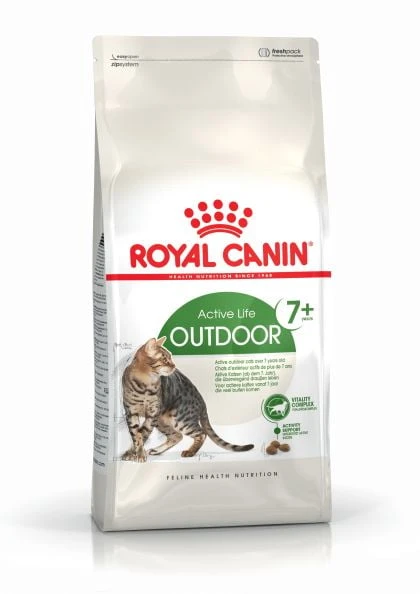Royal Canin Outdoor 7+ cat food is developed to address the nutritional needs of older cats who predominantly live outside by increasing the optimal caloric intake of your elderly cat to address its energy requirements.