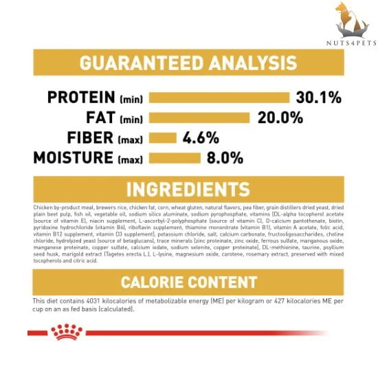 Poultry protein (dried), rice, animal fats, maize, vegetable protein isolate*, animal protein (hydrolysed), vegetable fibers, beet pulp, yeasts, minerals, fish oil, soya oil, fructo-oligo-saccharides, psyllium (psyllium husks and shells), yeast hydrolyzate (source of mannan-oligosaccharides), borage oil, marigold extract (source of lutein).