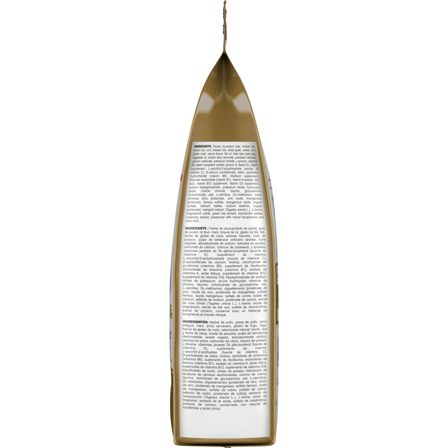 Rice, dehydrated poultry protein, animal fats, vegetable protein isolate, maize, hydrolysed animal protein, minerals, vegetable fibres, fish oil, beet pulp, soya oil, dried tomato, yeast hydrolyzate (MOS), hydrolysed crustaceans (glucosamine), marigold extract, green tea and grape seeds (polyphenols), hydrolysed cartilage (chondroitin).