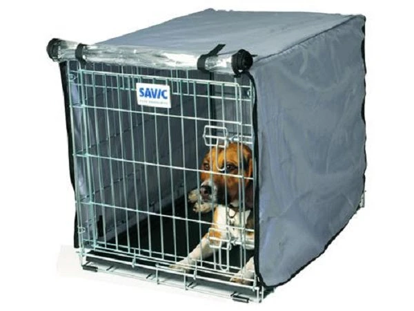 Nylon dog cage cover with the transparent foldable front door. The cover protects against sun and heat. A covered cage will help to calm a dog when it’s stressed. With a convenient bag for identity papers, a lead or a snack.