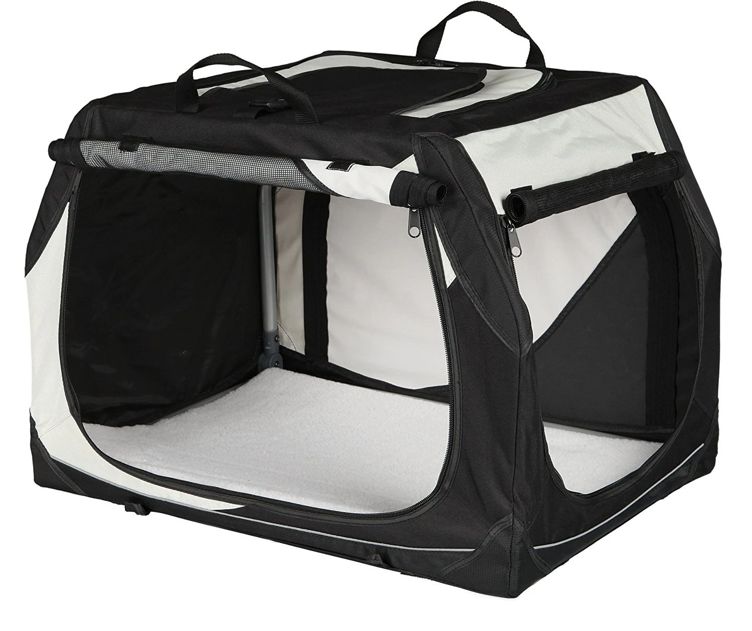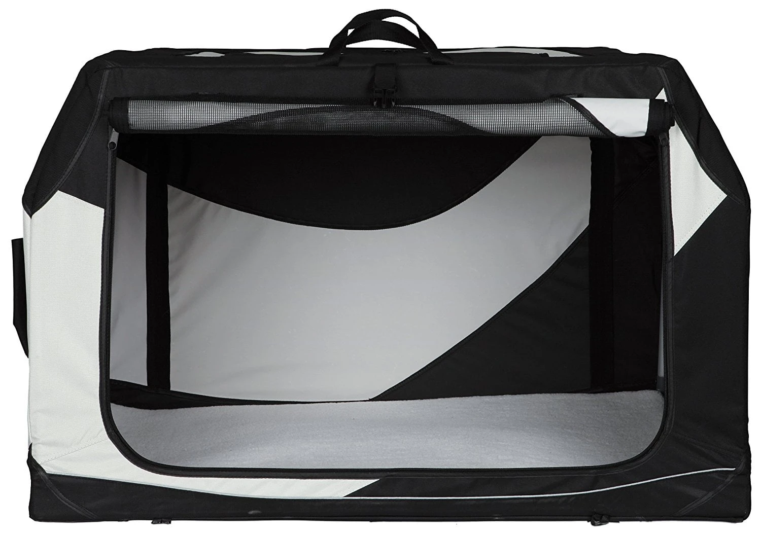 Use this carrier in the backseat or storage area of a vehicle or simply secure it to the ground outside to keep your pet comfortable at all times. The net inserts provide good circulation, while the fake lambskin inlay is cuddly and cozy. Includes 3 zip-open doors, a side pocket and a bottle holder.