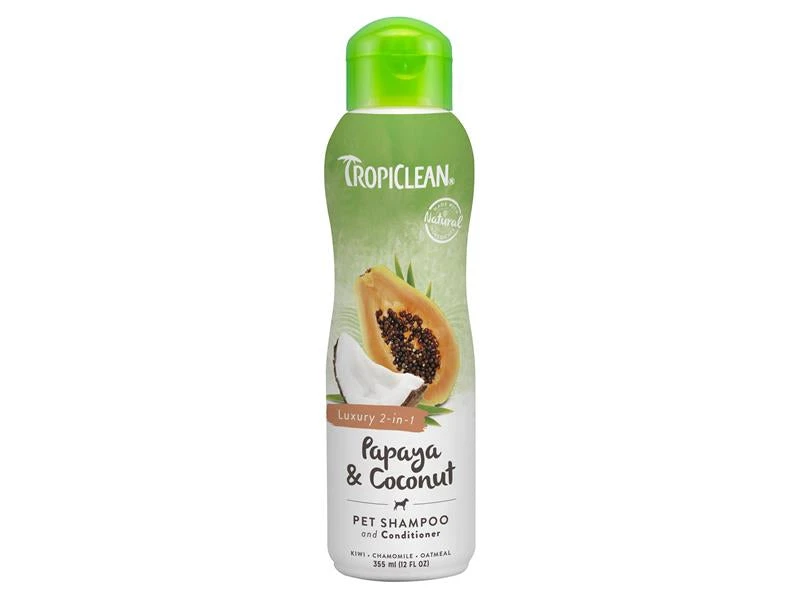 Tropiclean Papaya & Coconut Shampoo and Conditioner is made with papaya, coconut, and other tropical ingredients to pamper your pet in a rich, luxurious lather. This mild coconut cleanser is one-of-a-kind, just like your pet. Coconut gently cleanses fur of dirt and oils from playtime and head pats, while papaya and kiwi replenish the natural moisture balance of the skin and coat. Rich botanical conditioners result in a healthy sheen, while preventing dry skin and tangled fur. With routine bathing, this luxury 2-in-1 shampoo and conditioner will keep your pet’s skin and coat stay soft, shiny, and looking great.